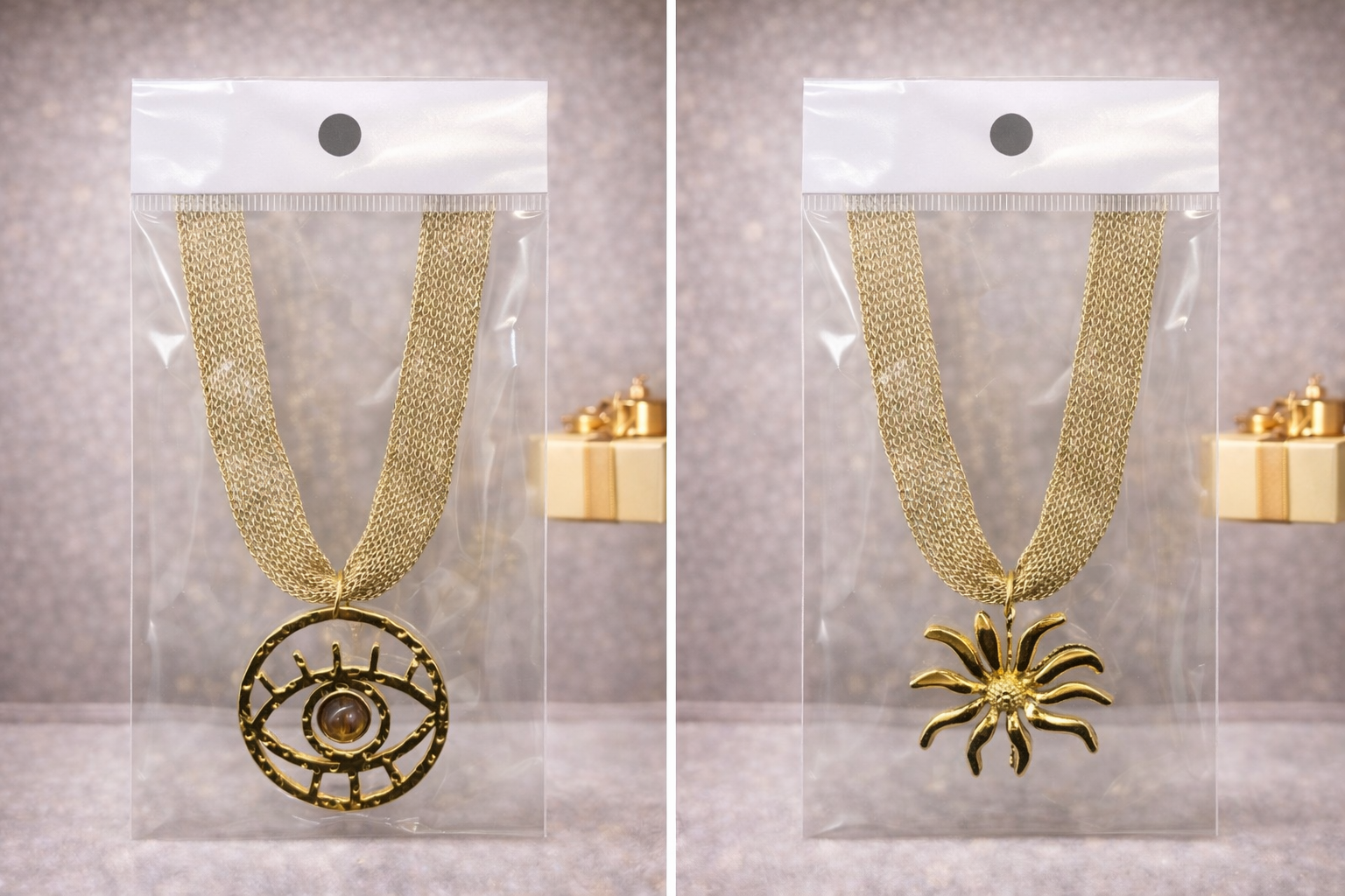 ✨ Collier maille dorée – Pendentif œil & soleil ✨